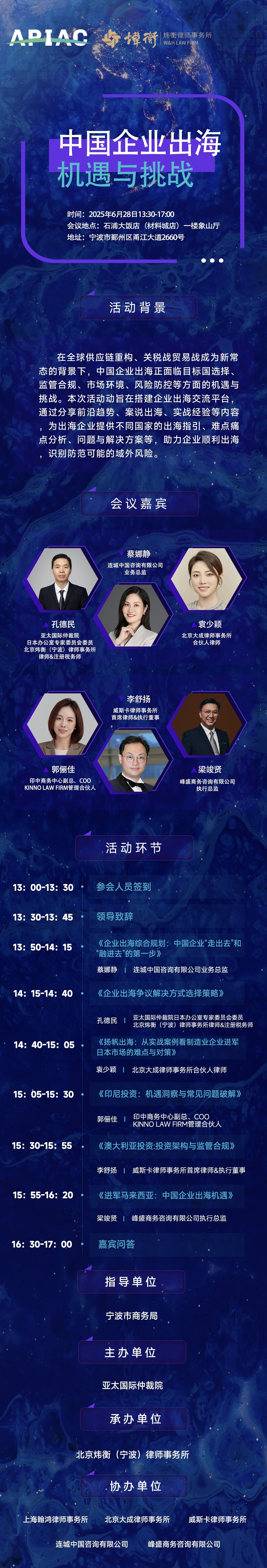 在全球供应链重构、关税战贸易战成为新常态的背景下,中国企业出海正面临目标国选择、监管合规、市场环境、风险防控等方面的机遇与挑战。本次活动动旨在搭建企业出海交流平台,通过分享前沿趋势、案说出海、实战经验等内容,为出海企业提供不同国家的出海指引、难点痛点分析、问题与解决方案等,助力企业顺利出海,识别防范可能的域外风险。