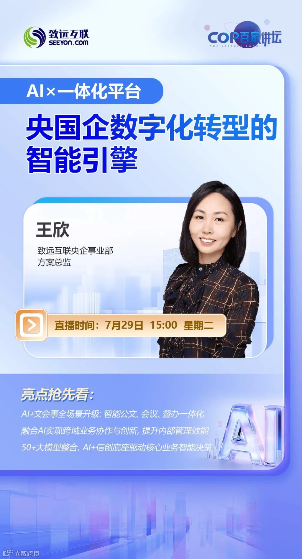 本次直播将深入解读2025年致远互联为央国企量身打造的数智化协同运营平台解决方案。从战略目标到落地实施,从技术架构到应用场景,全方位展现如何通过数字化工具助力央国企实现“赋能型”进化,提升运营效率与行业竞争力。