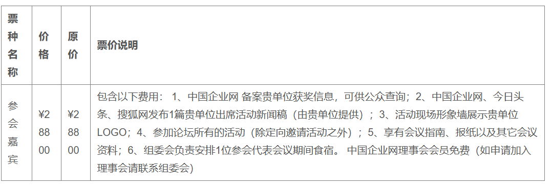 1、中国企业网 备案贵单位获奖信息,可供公众查询;2、中国企业网、今日头条、搜狐网发布1篇贵单位出席活动新闻稿(由贵单位提供);3、活动现场形象墙展示贵单位LOGO;4、参加论坛所有的活动(除定向邀请活动之外);5、享有会议指南、报纸以及其它会议资料;6、组委会负责安排1位参会代表会议期间食宿。中国企业网理事会会员免费