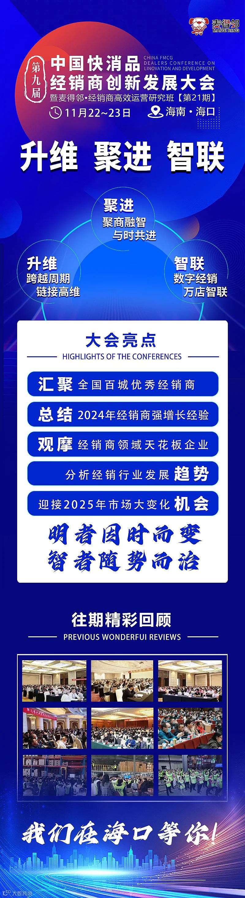 2024年11月22-23日,由麦得邻主办的第九届中国快消品经销商创新发展大会即将在中国•海口盛大召开,本次大会将以“升维•聚进•智联”为核心主题,汇聚全国百城优秀经销商,总结2024年经销商强增长经验,分析2025年经销行业发展趋势,实地观摩经销领域天花板企业...