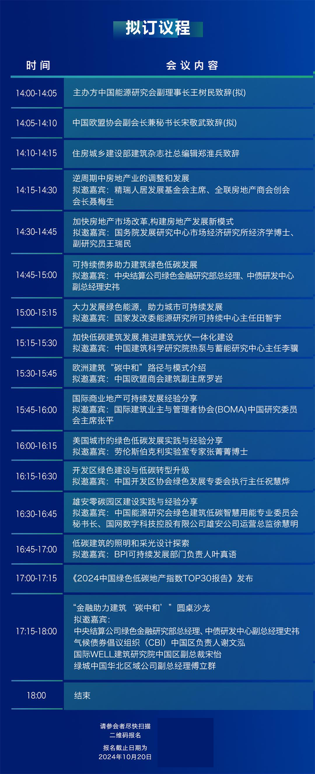 为加大绿色低碳宣传力度,推进城乡绿色低碳建设发展,促进城乡降碳减污,加大绿色金融对绿色低碳建筑支持力度,中国能源研究会拟定于2024年10月25日(星期五)在北京采取线上线下结合的方式举办2024国际绿色金融与建筑低碳智慧用能论坛。
