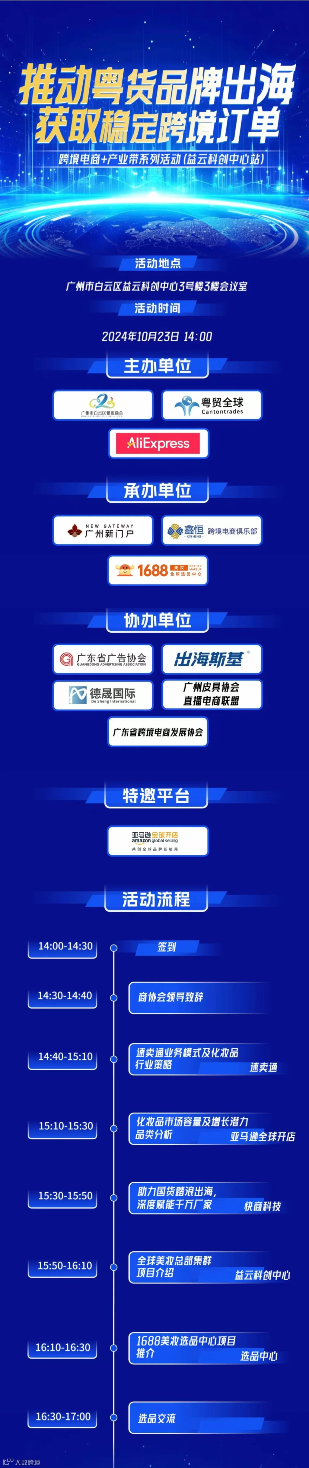 由广州市白云区物流商会、广东粤贸全球科技有限公司、速卖通联合主办的“推动粤货品牌出海 获取稳定跨境订单”(益云科创中心站)将于2024年10月23日在广州市白云区益云科创中心3号楼3楼会议室举行。