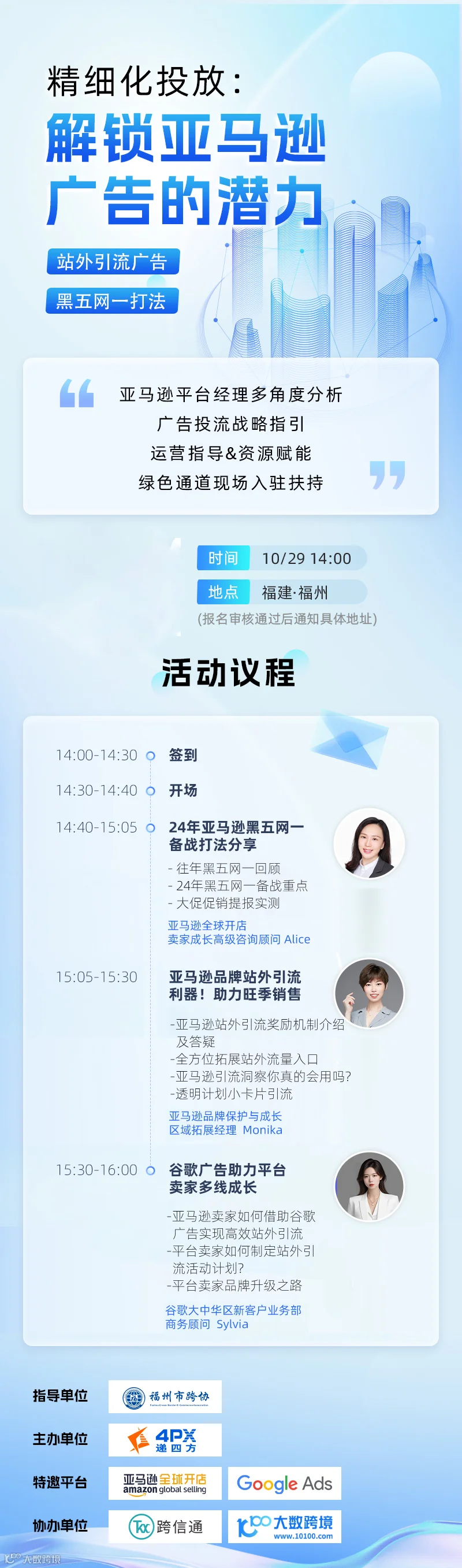 亚马逊全球开店卖家成长高级咨询顾问 Alice亚马逊品牌保护与成长区域拓展经理 Monika谷歌大中华区新客户业务部商务顾问 Sylvia
