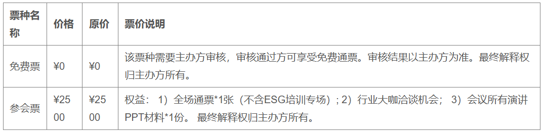 权益:1)全场通票*1张(不含ESG培训专场);2)行业大咖治谈机会;3)会议所有演讲PPT材料*1份。最终解释权归主办方所有。