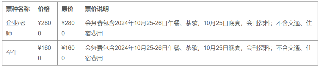 企业/老师:会务费包含2024年10月25-26日午餐、茶歌,10月25日晚宴,会刊资料;不含交通、住宿费用