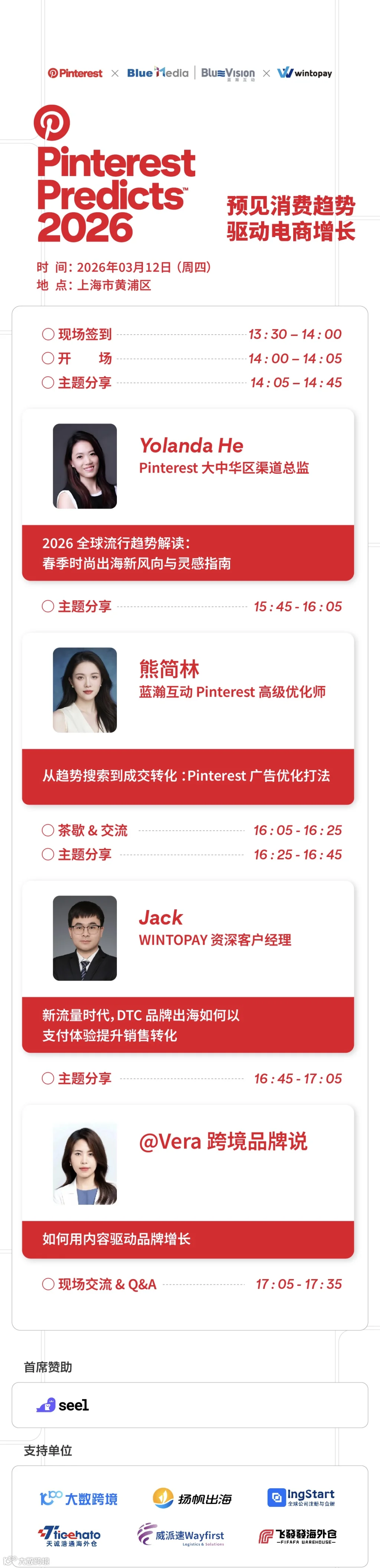 本次活动由 Pinterest、蓝瀚互动与 WINTOPAY 联合主办,目的在将趋势洞察转化为实战增长方案,帮助独立站卖家打通从消费趋势发现到订单转化的全链路,实现可持续增长。