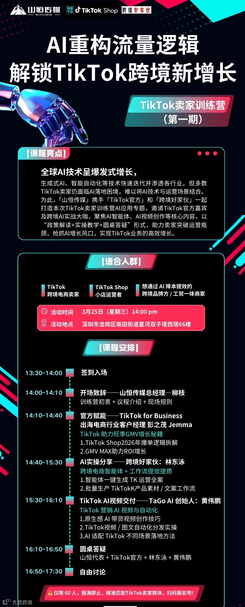 全球 AI 技术呈爆发式增长,生成式 AI、智能自动化等技术快速迭代并渗透各行业。但多数 TikTok 卖家仍面临 AI 落地困境,难以将 AI 技术与运营场景结合。为此,「山恒传媒」携手「TikTok 官方」和「跨境好家伙」一起打造本次 TikTok 卖家训练营 AI 应用专题,邀请 TikTok 官方嘉宾及跨境 AI 实战大咖,聚焦 AI 智能体、AI 视频创作等核心内容,以 “政策解读 + 实操教学 + 圆桌答疑” 形式,助力卖家突破运营瓶颈,抢抓 AI 增长风口,实现 TikTok 业务的高效增长。