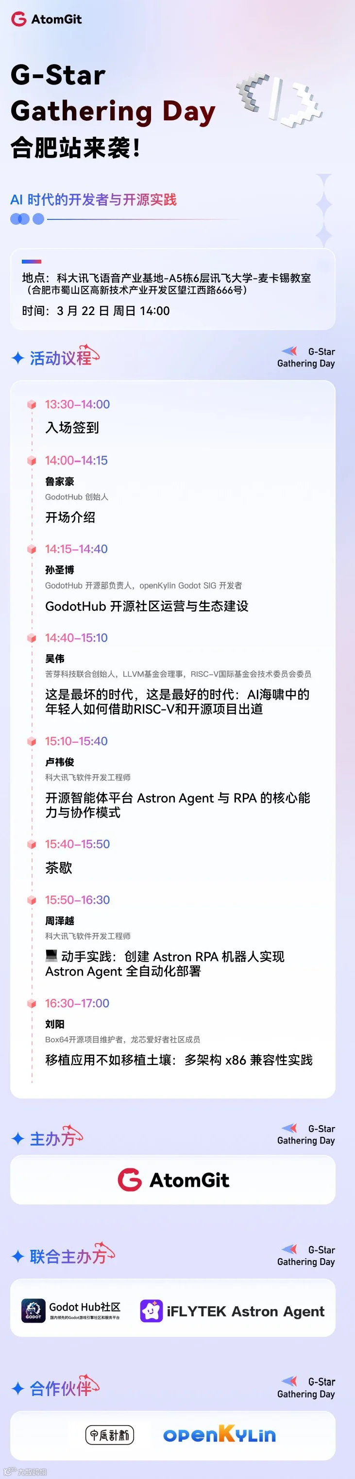 3 月 22 日,AtomGit 联合 GodotHub、iFLYTEK Astron Agent 在合肥发起 G-Star Gathering Day 开发者沙龙。