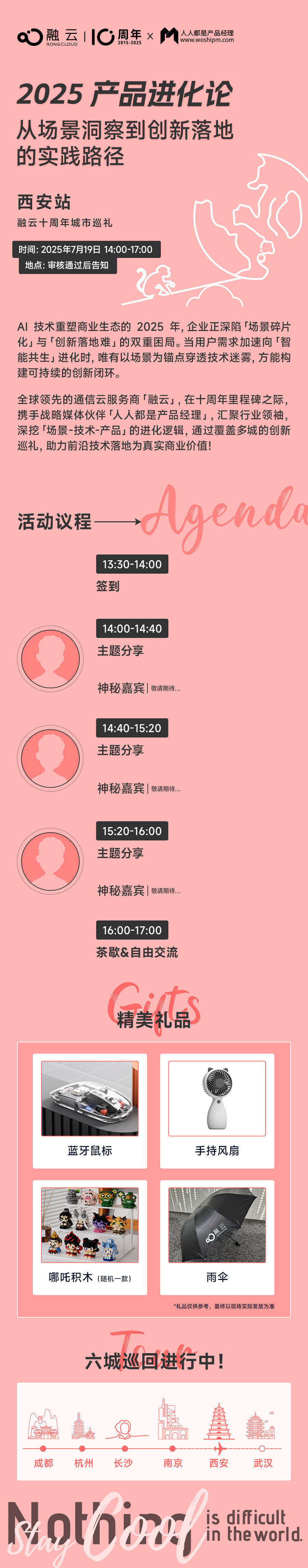 为了帮助产品经理把握从场景洞察到落地验证的创新实践方法论,在 AI 浪潮中锚定方向,全球领先的通信云服务商「融云」在十周年里程碑之际,携手「人人都是产品经理」开展 6 城巡回主题闭门会。