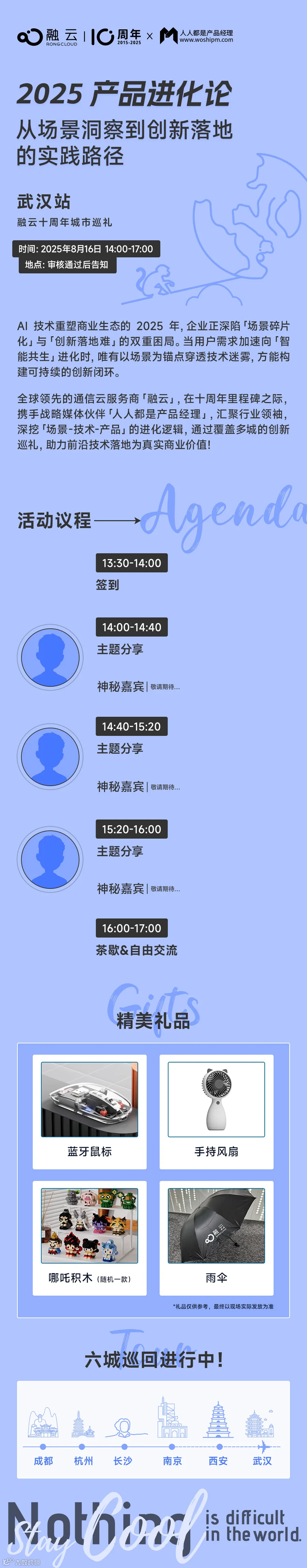 目前成都、杭州、长沙站已圆满收官,吸引了 300+ 产品经理、业务负责人共同探索 AI 场景化落地的实战路径。8 月 16 日武汉站,精彩继续。活动议程还在精心筹备中,欢迎大家提前报名锁定名额!
