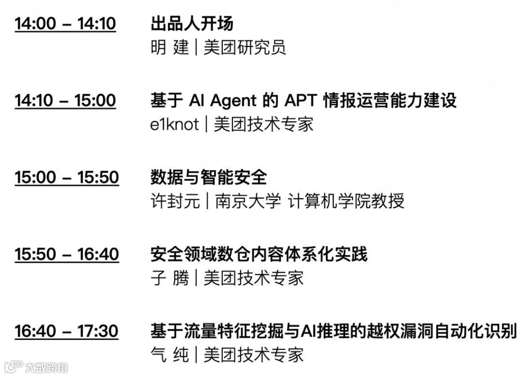 本次沙龙聚焦AI安全领域创新实践,美团技术专家将分享AI驱动的威胁情报分析、智能数据治理和自动化漏洞挖掘等实战经验。我们还特别邀请到南京大学许封元教授分享数据与智能安全,探讨可信计算架构、数据质量评估和LLM辅助分析等前沿技术。