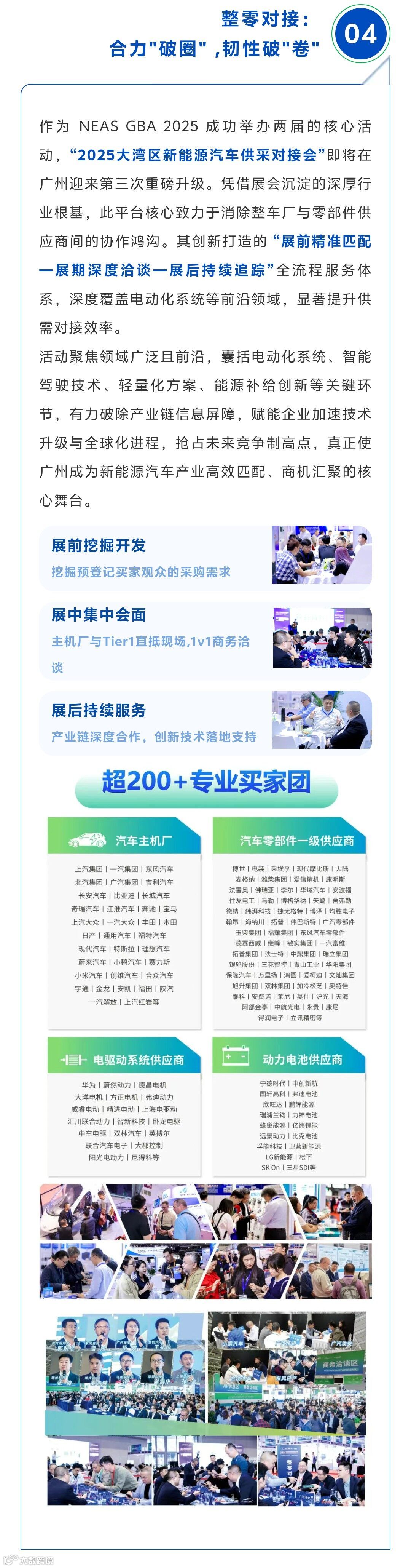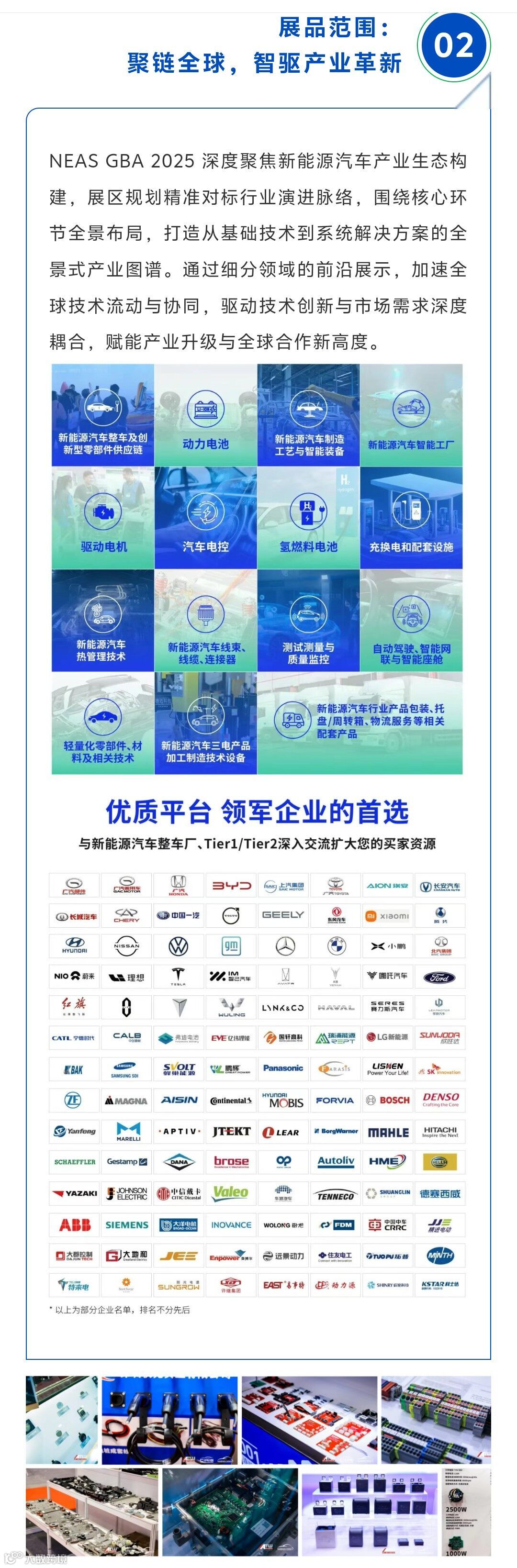 掌驭智电风云势,擎动湾区未来芯!2025年10月22-24日,第十五届大湾区国际新能源汽车技术与供应链博览会(NEAS GBA 2025)将在广州空港博览中心震撼启幕!由英佛会展联合广东省汽车行业协会、中国电工技术学会以及广东省新能源汽车产业协会、广东省大湾区新能源汽车产业技术创新联盟等知名行业协会联手强力打造,本届盛会以“全球协同·技术破界·韧性未来” 为主题,直击产业技术融合、供应链韧性及全球化发展核心,NEAS GBA 2025 将聚力熔铸“硅谷创新”与“底特律智造”的双城基因,构建全球要素高效流转的双循环枢纽!