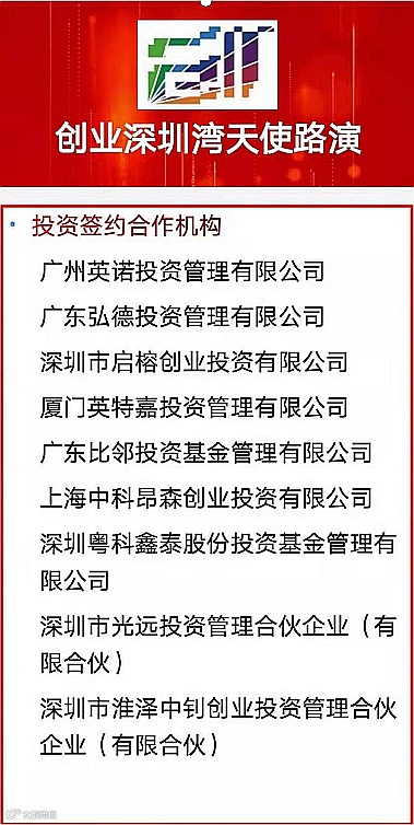 2、创业深圳湾天使投资路演会,自2021年开办以来,联合签约英诺、比邻、光远等十多家天使投资机构,为创业者举办路演活动13期,融资过亿元。