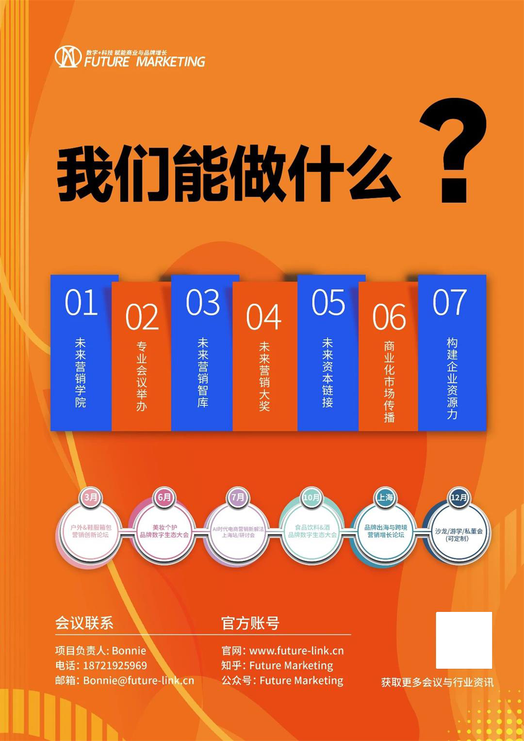 FUTURE MARKETING 是聚焦【数字+科技 赋能品牌与生意增长】的会议论坛主办方。帮助品牌创始人与IT及营销决策者,汲取行业经验&洞察,快速链接数字生态上下游的伙伴与品牌友商。我们拥有整合型媒体资源,可帮助B2B企业打造商业化市场传播方案,助力企业品牌升级,商业对接。资源聚焦:快消、汽车、奢侈品、美妆、食品&饮料、鞋服、3C&家电、航空&文旅、医疗&大健康等行业。近期会议规划:食品饮料&酒品牌数字生态大会暨未来营销大奖颁奖盛典