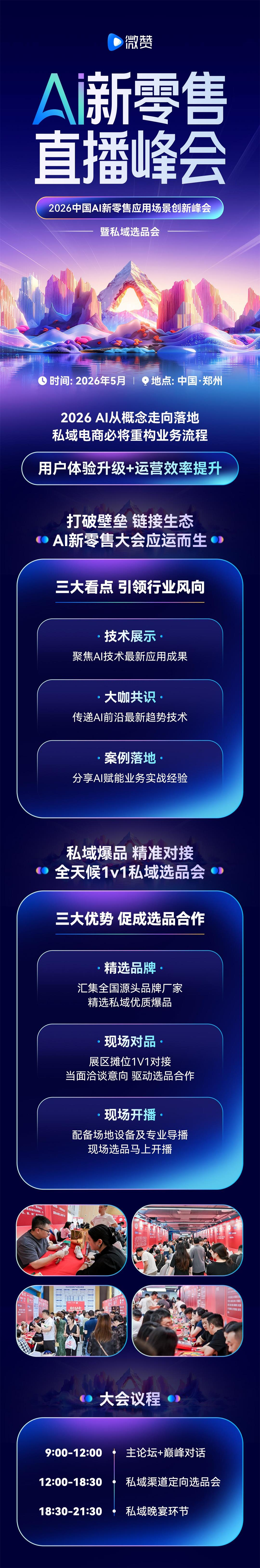 AI重塑零售,私域引爆增长。私域流量运营,作为连接用户与品牌的“最后一公里”,通过AI技术实现业务流程重构、用户体验升级和流量运营效率提升成为企业突围的关键路径。打破壁垒、链接生态,2026 AI+新零售直播大会暨私域渠道千人选品会应运而生。