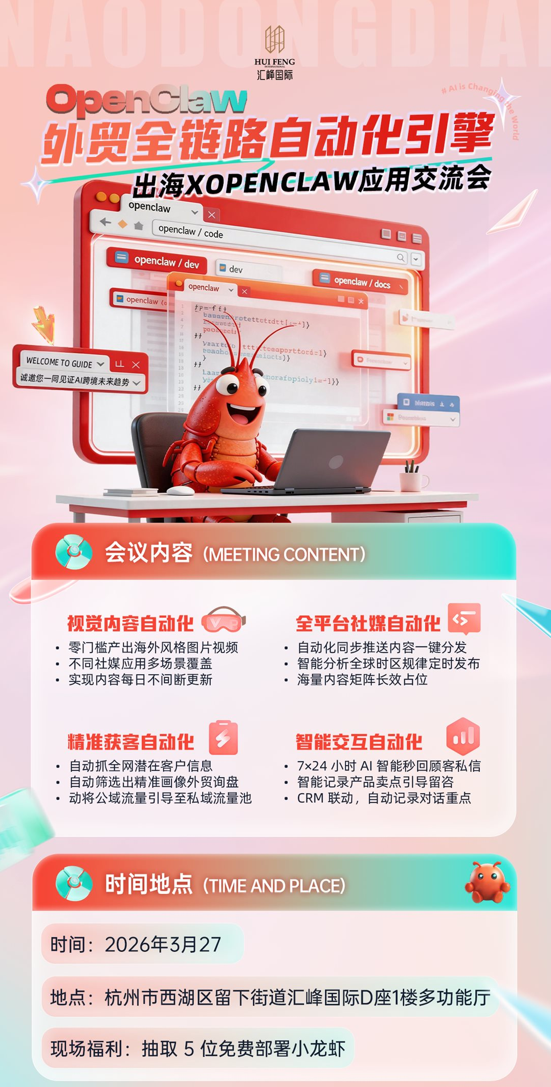 会议内容包括视觉内容自动化(零门槛产出海外风格图片视频、多场景覆盖、实现内容每日不间断更新)、全平台社媒自动化(自动化同步推送内容一键分发、智能分析全球时区规律定时发布、海量内容矩阵长效占位精准获客)、精准获客自动化(自动抓全网潜在客户信息、自动筛选出精准画像外贸询盘、将公域流量引导至私域流量池)、智能交互自动化(7×24小时AI智能秒回顾客私信、智能记录产品卖点引导留客、CRM联动自动记录对话重点)。