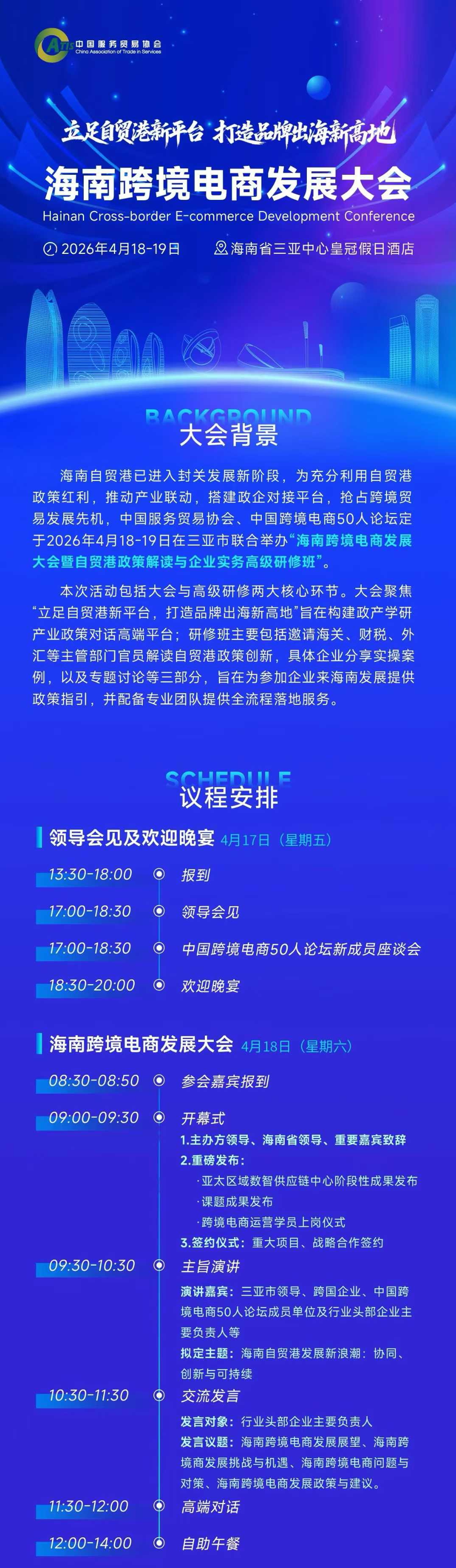 海南自贸港已进入封关发展新阶段,为充分利用自贸港政策红利,推动产业联动,搭建政企对接平台,抢占跨境贸易发展先机,中国服务贸易协会、中国跨境电商50人论坛联合举办本次大会。活动包括大会与高级研修两大核心环节,聚焦“立足自贸港新平台,打造品牌出海新高地”,旨在构建政产学研产业政策对话高端平台;研修班主要邀请海关、财税、外汇等主管部门官员解读自贸港政策创新,具体企业分享实操案例,以及专题讨论等三部分,旨在为参加企业来海南发展提供政策指引,并配备专业团队提供全流程落地服务。