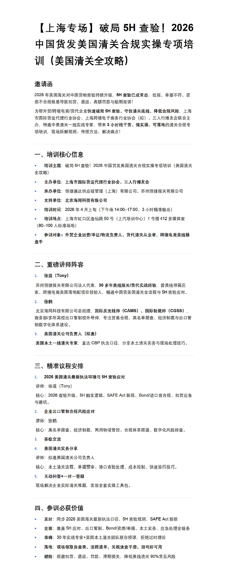 为帮外贸/跨境电商/货代企业快速破局5H查验、守住清关底线、降低合规风险,上海市国际货运代理行业协会、三人行博友会联合主办,特邀中美清关一线实战专家,带来3小时纯干货、强实操、可落地的清关合规专项培训,现场拆解规则、传授方法、解决痛点!