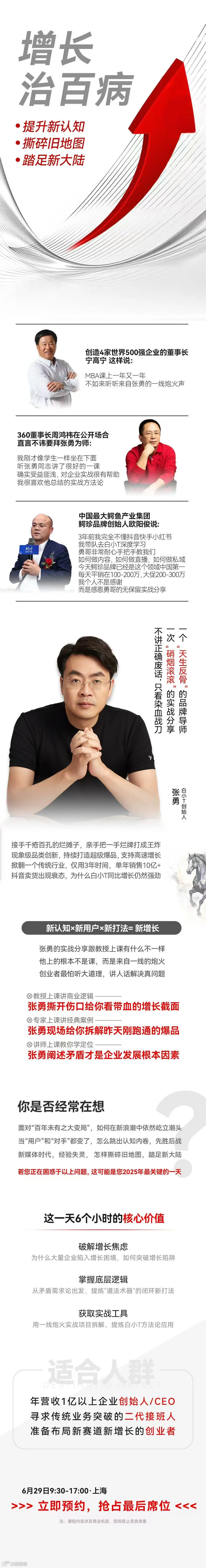 这一天6个小时的核心价值• 破解增长焦虑为什么大量企业陷入增长困境,如何突破增长陷阱• 掌握底层逻辑从矛盾需求论出发,提炼“道法术器”的闭环新打法• 获取实战工具用一线炮火实战项目拆解,提炼白小T方法论应用适合人群年营收1亿以上企业创始人/CEO,寻求传统业务突破的二代接班人,