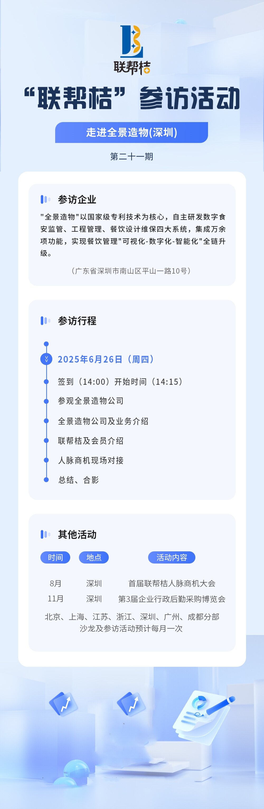 📣邀您和好友免费报名参加第21期联帮桔参访活动,现场对接人脉商机!欢迎大家积极报名参与。