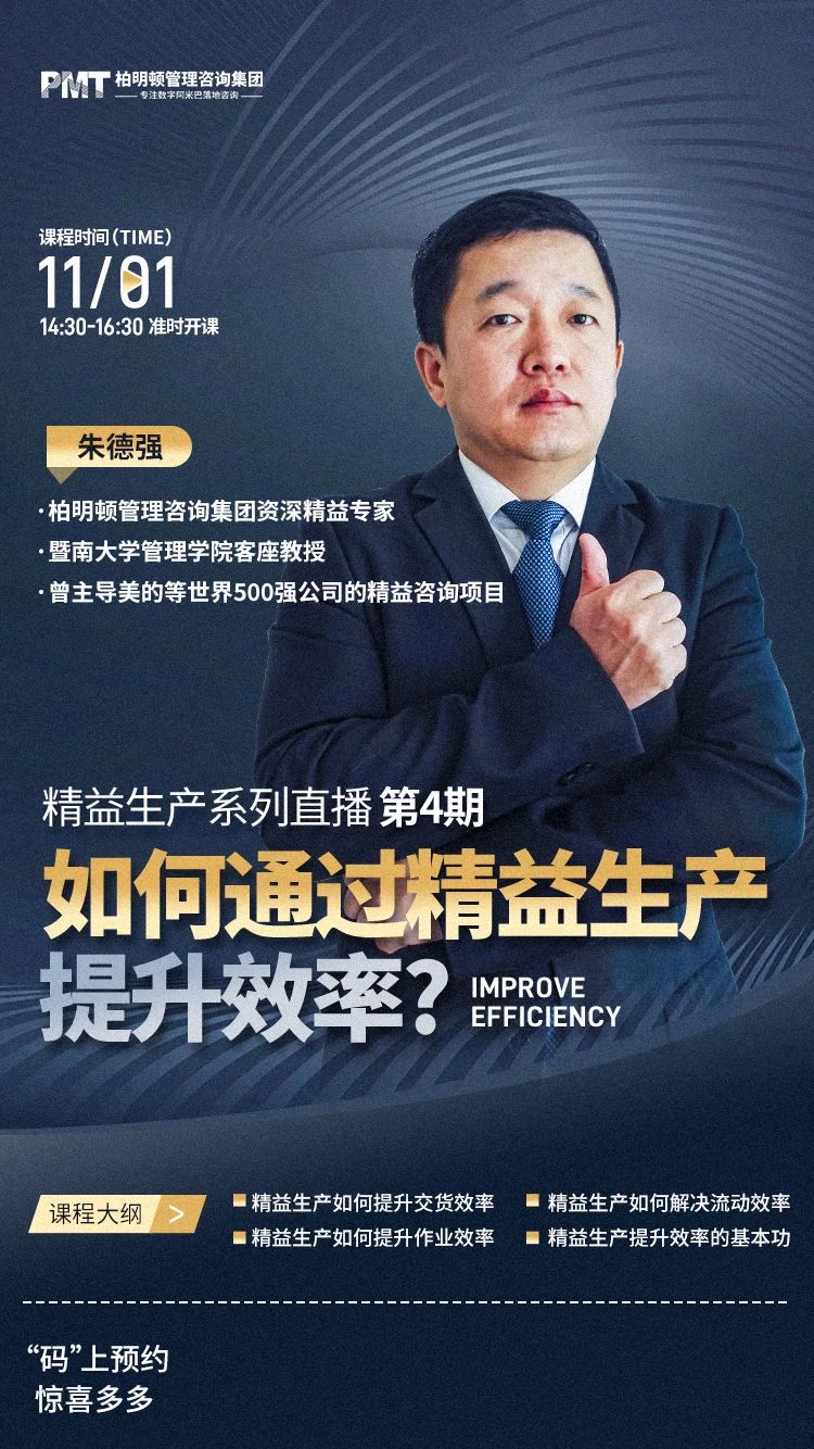 11月1日(周五)14:30,朱德强老师精益生产系列第四期准时开讲——《如何通过精益生产提升效率》。