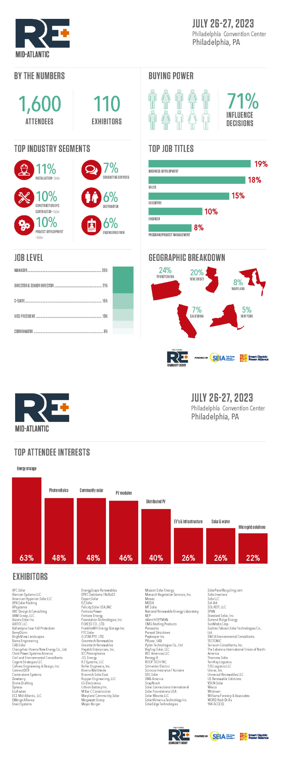 费城太阳能光伏和储能展览会(RE+MID-ATLANTIC)是美国一个不断发展的清洁能源市场。加入与行业买家,供应商,分销商,顾问等的对话,探索解决方案,交流想法和发现新技术。来自欧洲、美国、中国和拉丁美洲的数百家光伏企业将在全球范围内展示太阳能和储能技术。