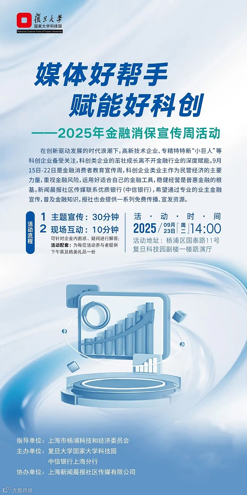 迸家创新驱动发展的时代浪潮下,高新技术企业、专精特特新“小巨人”等科创企业备受关注,科创类企业的茁壮成长离不开金融行业的深度赋能。9月15日-22日是金融消费者教育宣传周,科创企业类业主作为民营经济的主要力量,重视金融风险,运用好适合自己的金融工具,稳健经营是普惠金融的根基。新闻晨报社区传媒联系优质银行(中信银行),希望通过专业的业主金融宣传,普及金融知识,报社也会提供一系列免费传播、宣发资源。