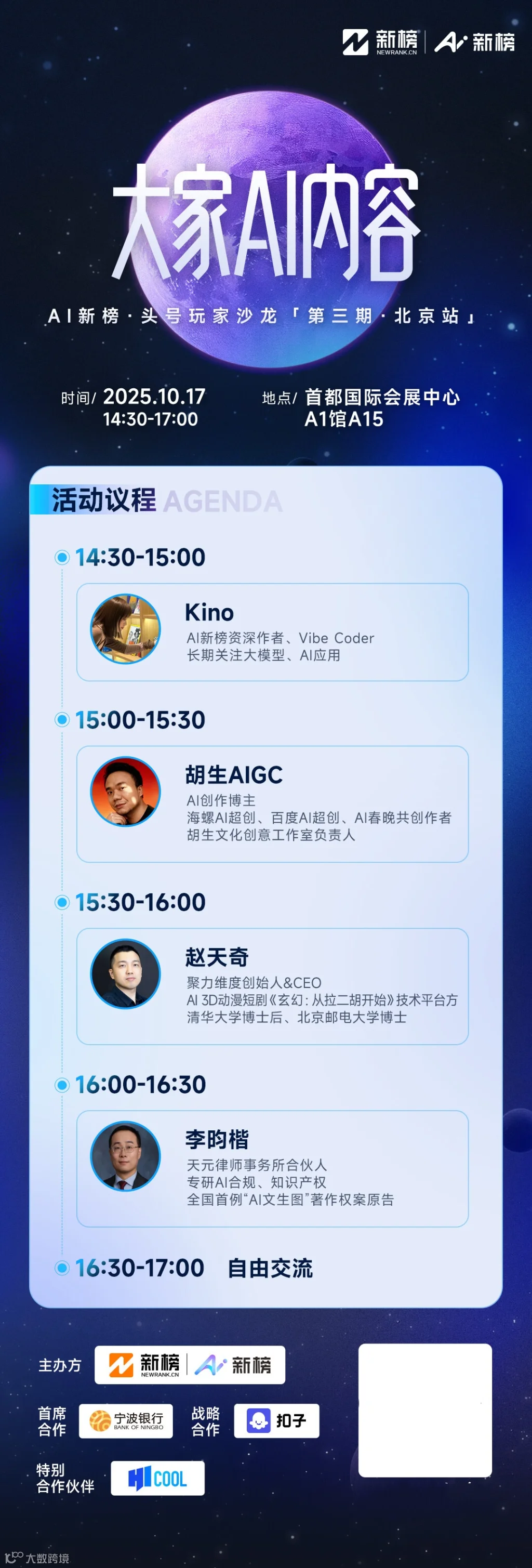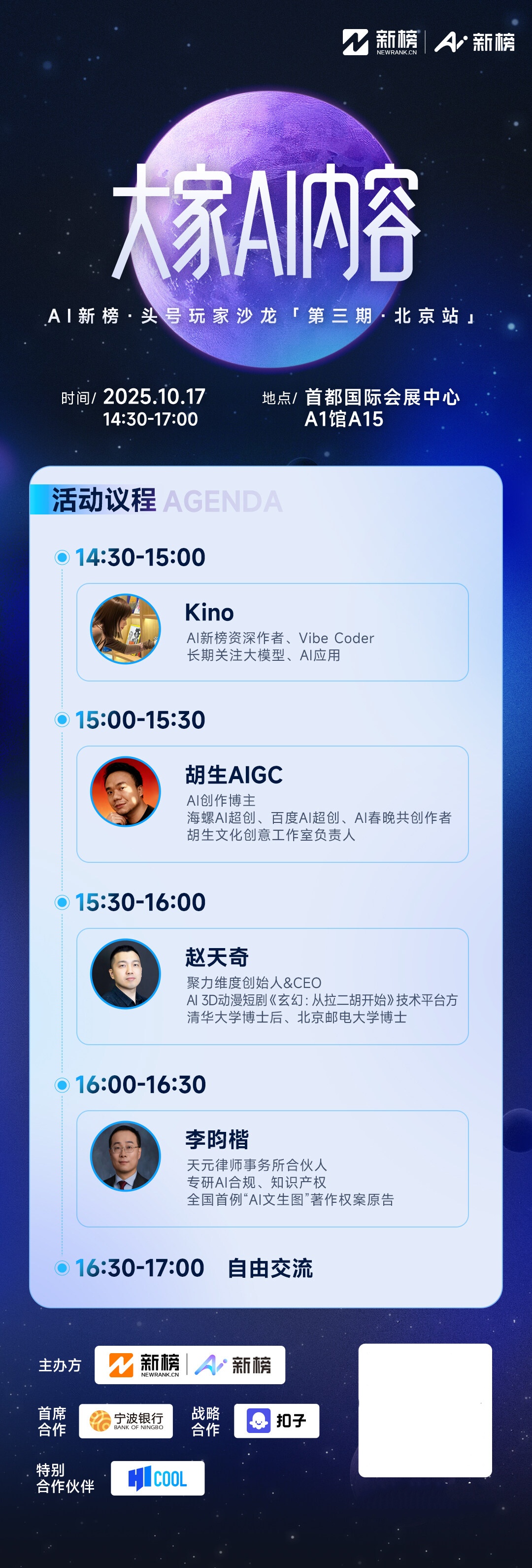10月17日,「AI 新榜・头号玩家系列沙龙」将第三次来到北京!我们期待与最懂 AI 的你相遇 —— 无论你是深耕技术的实践者、玩转 AI 创作的探索者,还是洞察行业的观察者,都欢迎带着你的经验与思考加入这场聚会,与同频伙伴一起,在交流中挖掘 AI 的更多可能,在探讨中预见行业的未来方向。