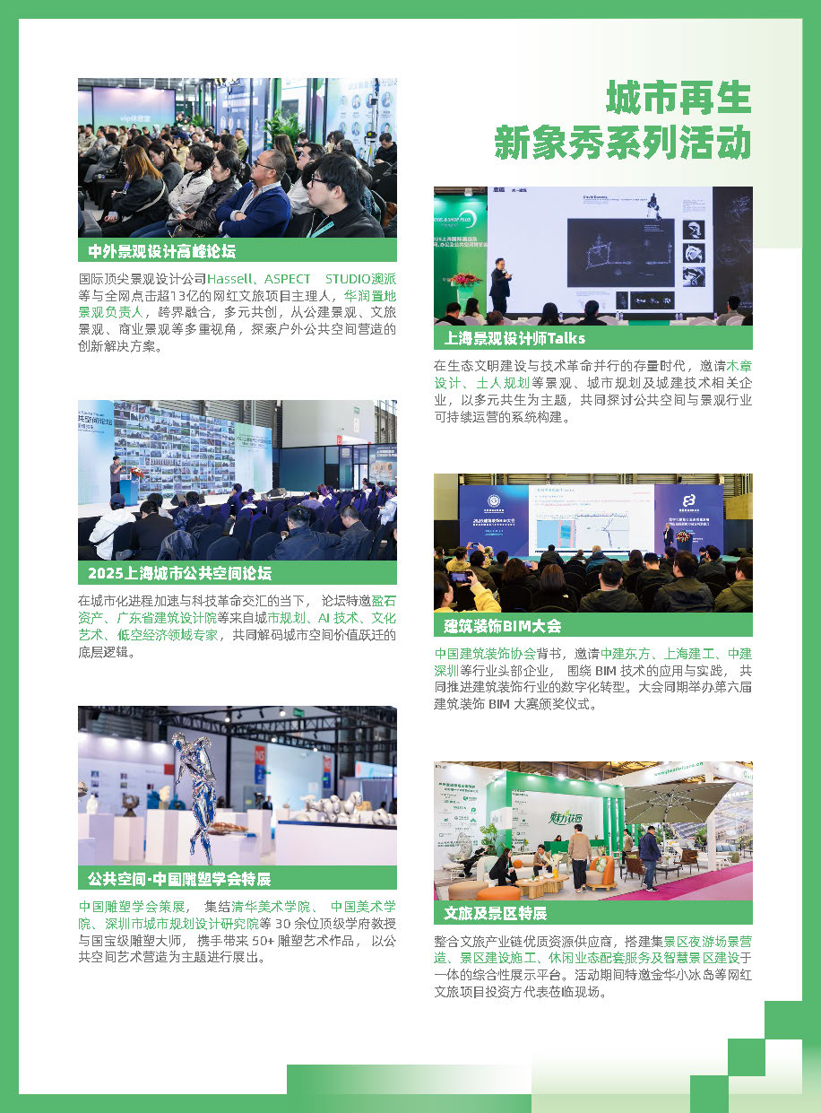 展会同期举办“城市再生新象秀系列活动”,内容涵盖“展会、颁奖、专题活动”等多种形式的活动分别从公共空间及城市更新的建设与运营、筹建与设计、智能化趋势发展等多个维度全面呈现城市新象的最新趋势与经验。
