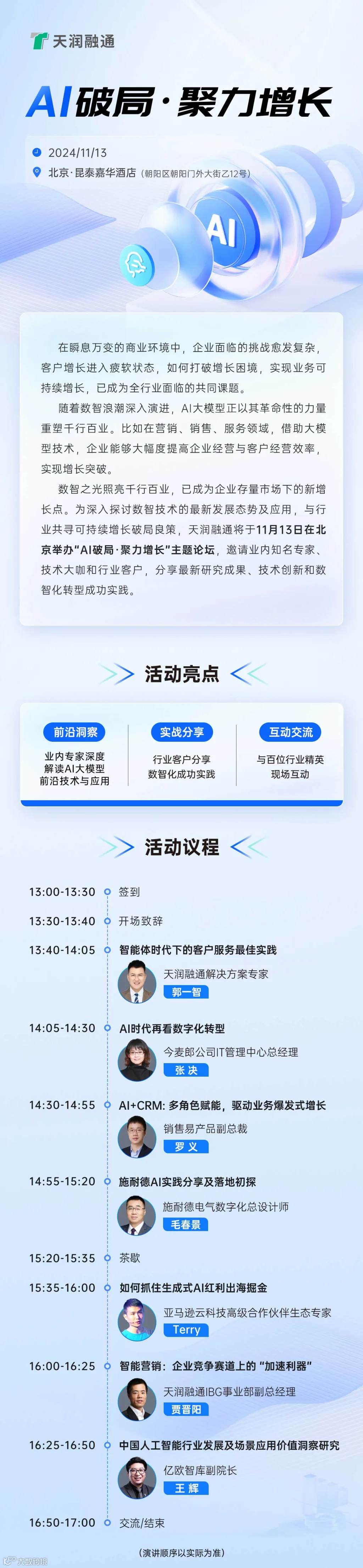 11月13日(周三)在北京举办"AI破局·聚力增长"主题论坛,
