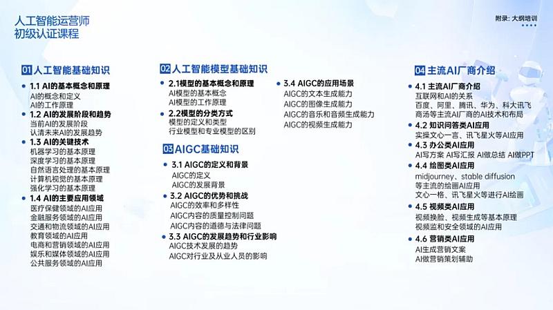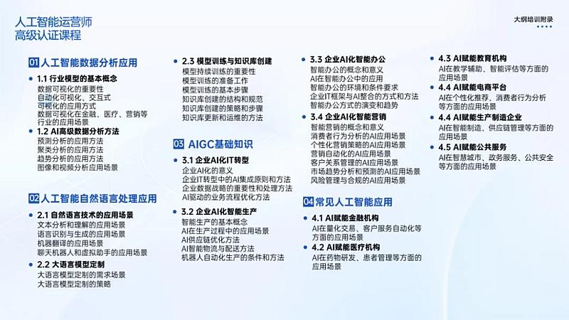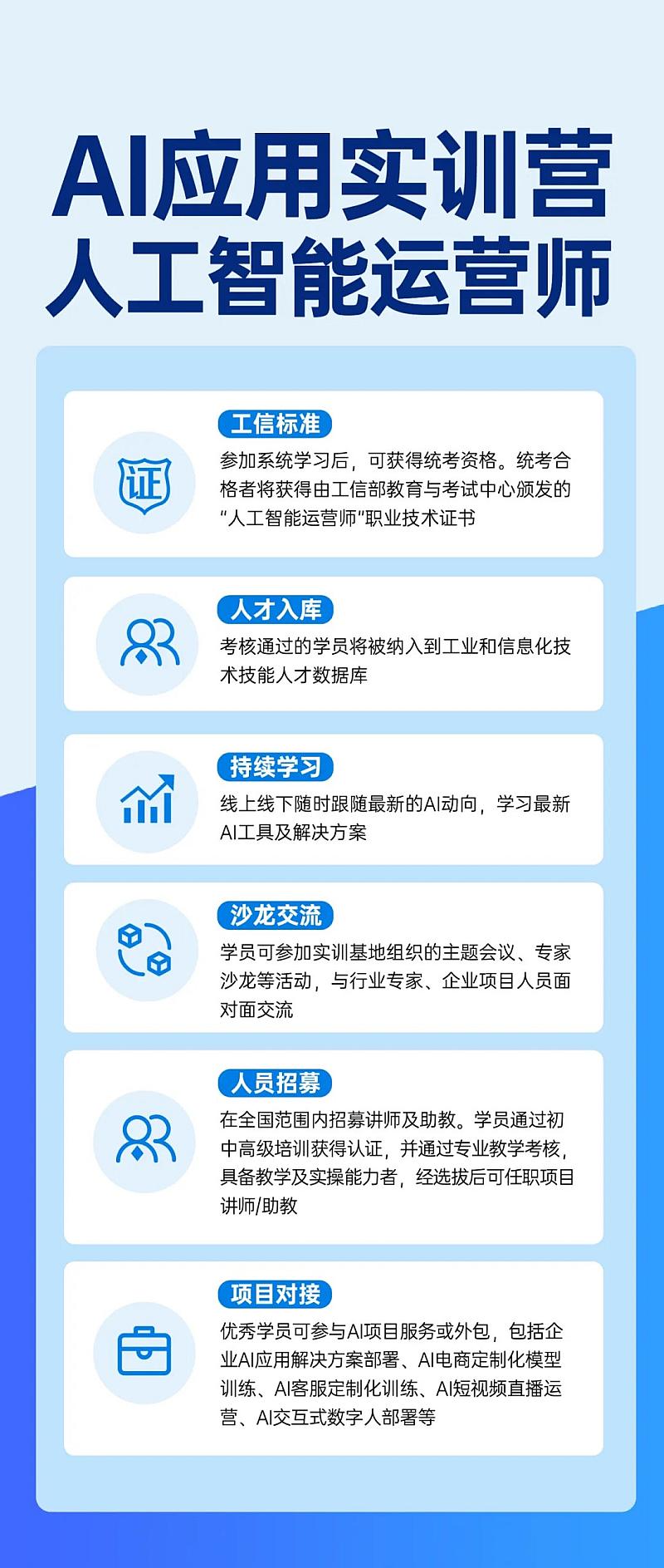 面对这一人才缺口,我们推出人工智能应用实训营,在工信人才培养工程标准指导下进行“人工智能运营师”培训及考证,旨在培养能够满足时代需求的AI应用人才。