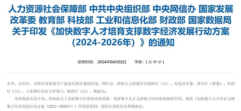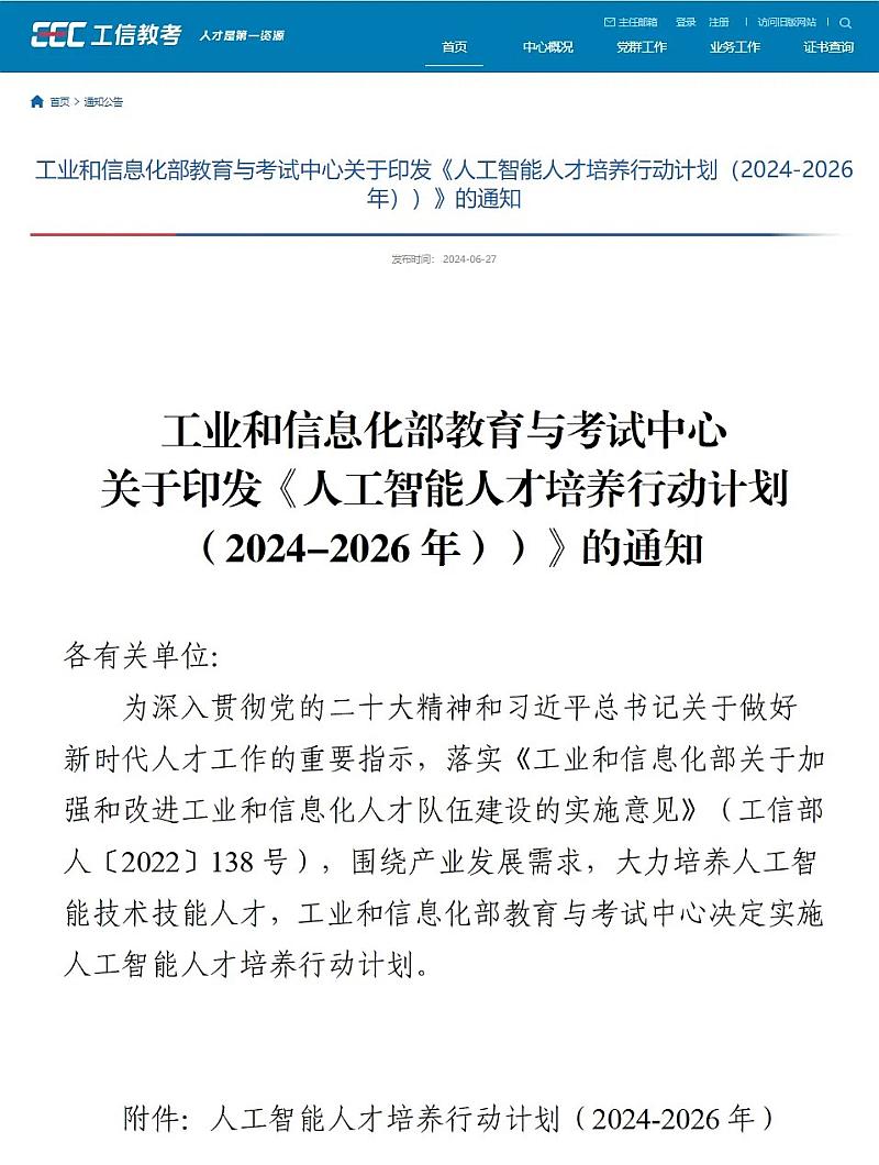为积极响应国家政策,推动人工智能应用型人才的培养,工业和信息化部教育与考试中心印发《人工智能人才培养行动计划(2024-2026年)》