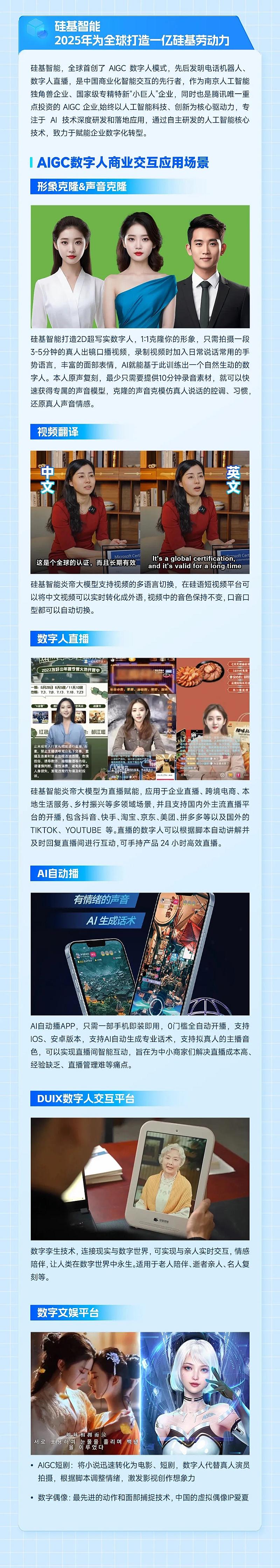 重庆硅基智能科技有限公司是硅基智能全国运营中心,贯彻落实工信人才培养计划,执行工信教考培训标准,成为工信教育与考试中心《人工智能运营师》实训授权单位,是一家以服务智能化和知识智能化为核心的人工智能创新企业,以自研数字系统与营销系统为核心,通过硅基数字人,让客户在数字化转型中拥有以算力为核心的创新竞争力。
