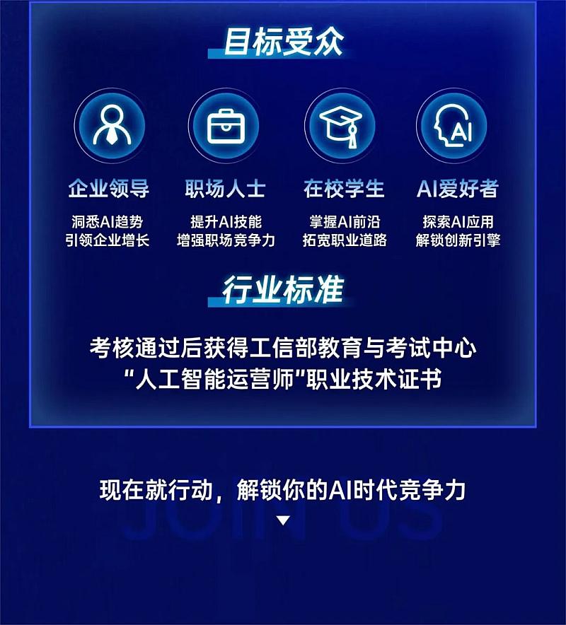 本次培训面向广大对AI人工智能运营感兴趣的人群,无论您是初学者还是具有一定经验的从业者,都能在这里找到适合自己的提升路径。