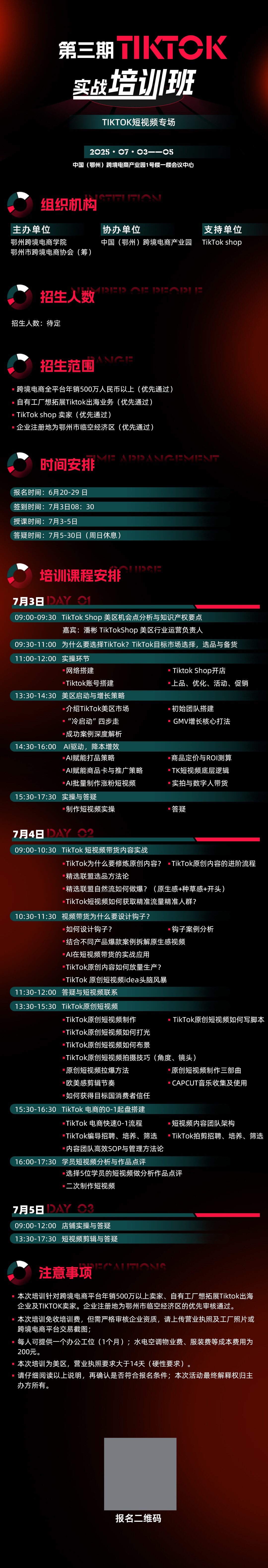 工厂转型TITOK票说明:1、本次培训针对跨境电商平台年销500万以上卖家、自有工厂想拓展Tiktok出海企业及TIKTOK卖家。企业注册地为鄂州市临空经济区的优先审核通过。 2、本次培训免收培训费,但需严格审核企业资质,请上传营业执照及工厂照片或跨境电商平台交易截图; 3、每人可提供一个办公工位(1个月);水电空调物业费、服装费等成本费用为200元。 4、本次培训为美区,营业执照要求大于14天(硬性要求)。 5、请仔细阅读以上说明,再确认是否符合报名条件;本次活动最终解释权归主办方所有。