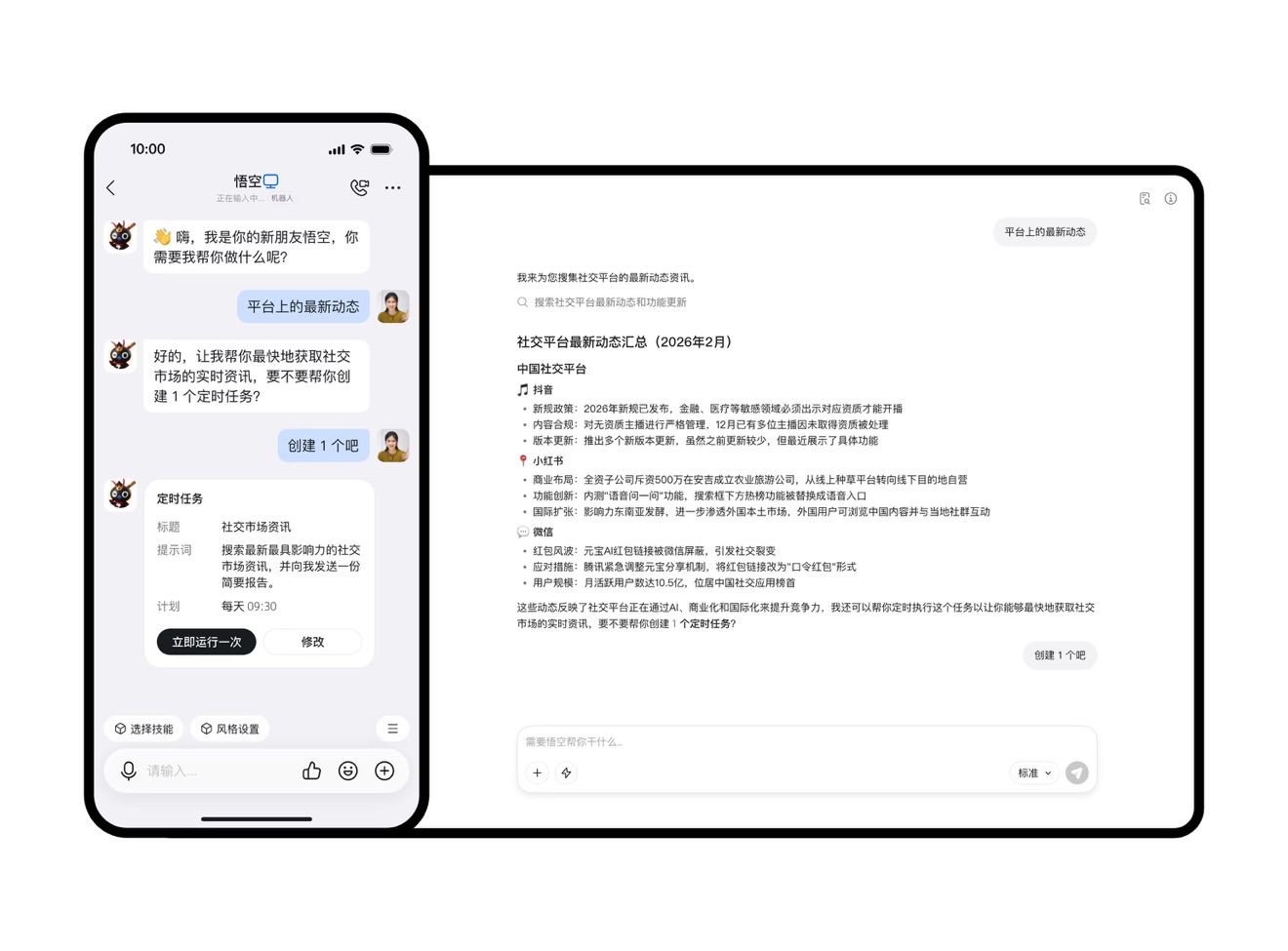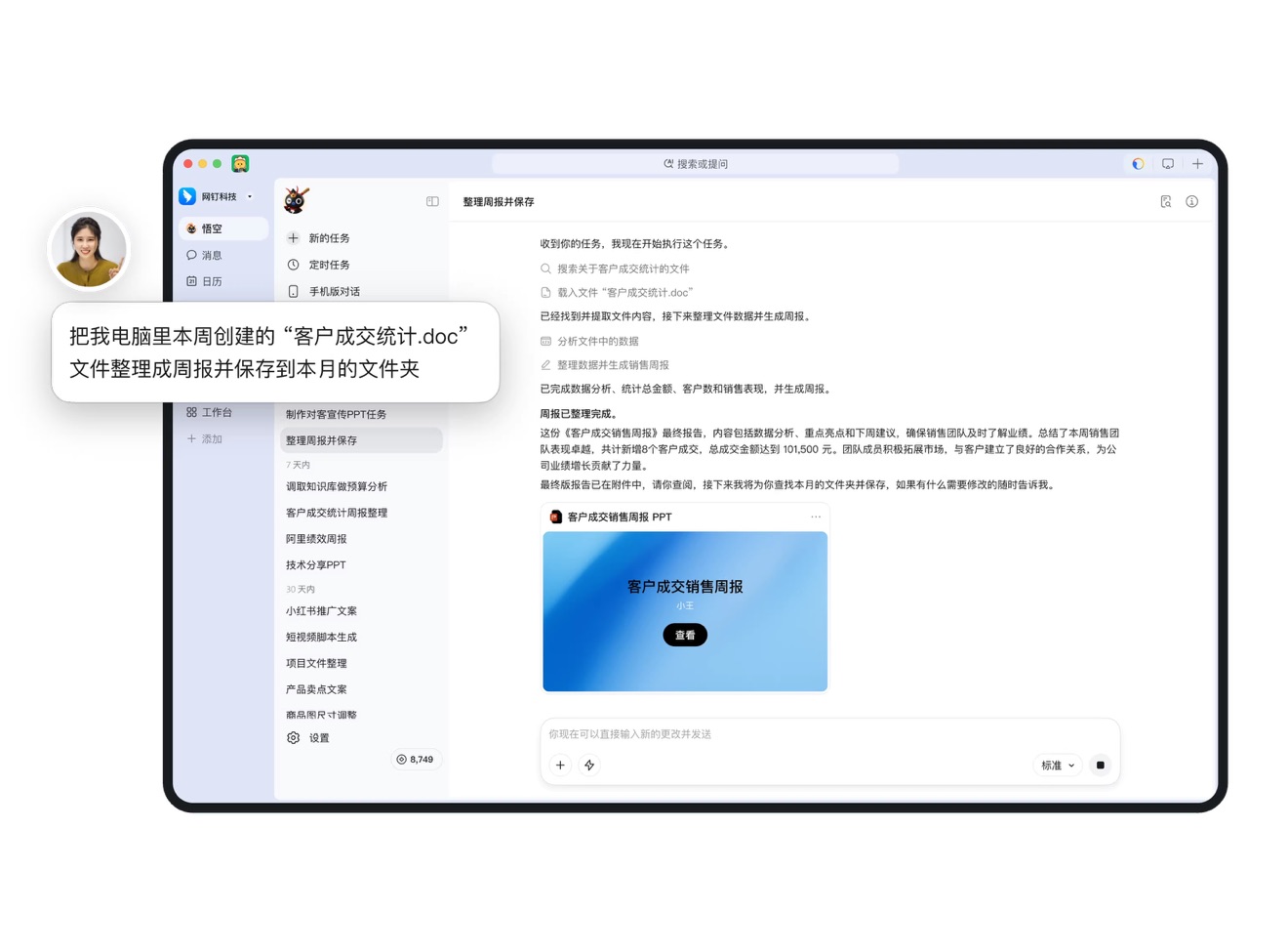 传统 AI 助手只能回答问题、生成文本。悟空更进一步—它能直接操作你的电脑完成任务。不是告诉你怎么做,而是直接帮你做