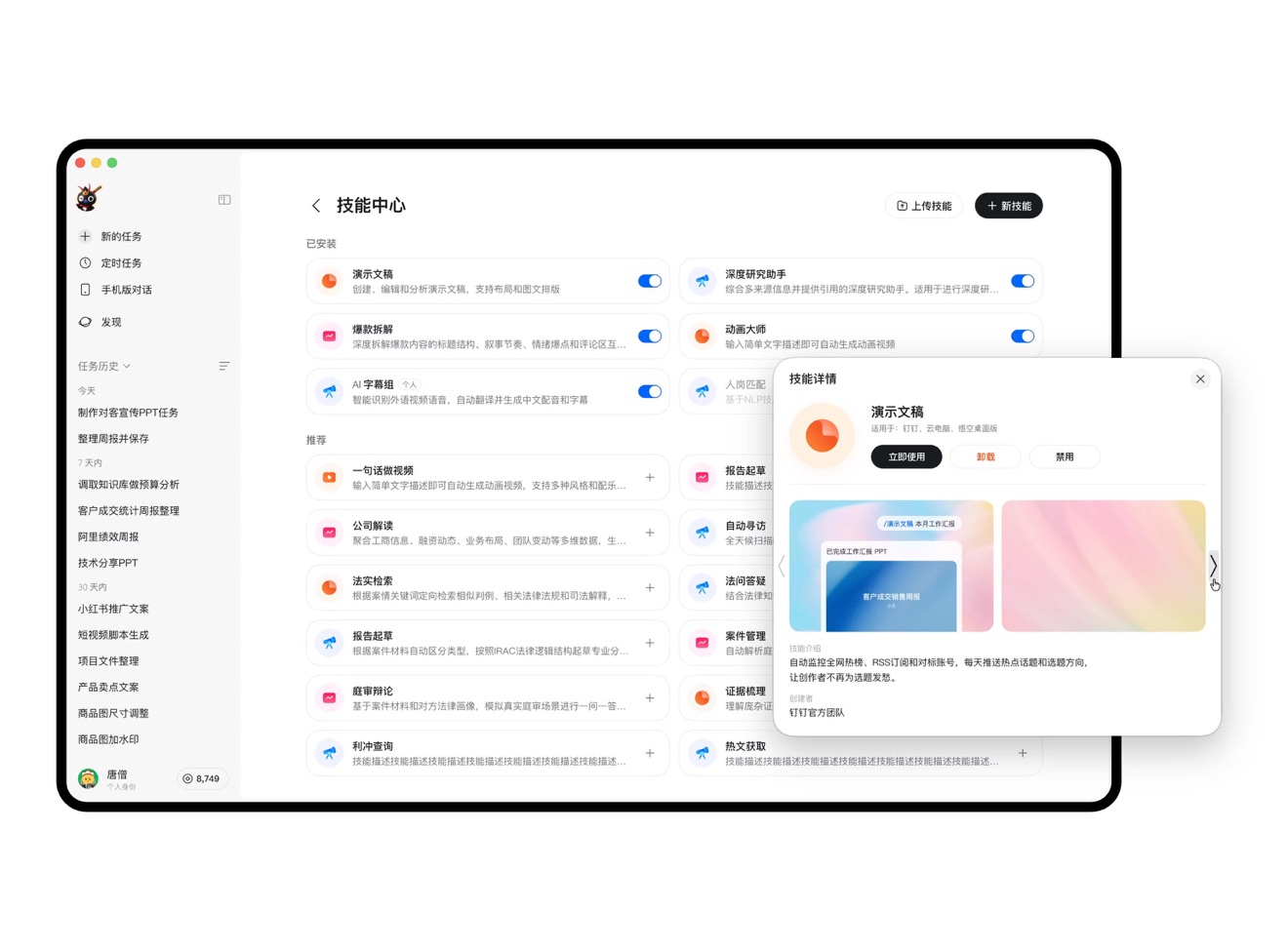 悟空的技能市场持续丰富,覆盖内容创作、电商运营、数据分析、法务财务等多个领域,并支持用户自己添加Skill。