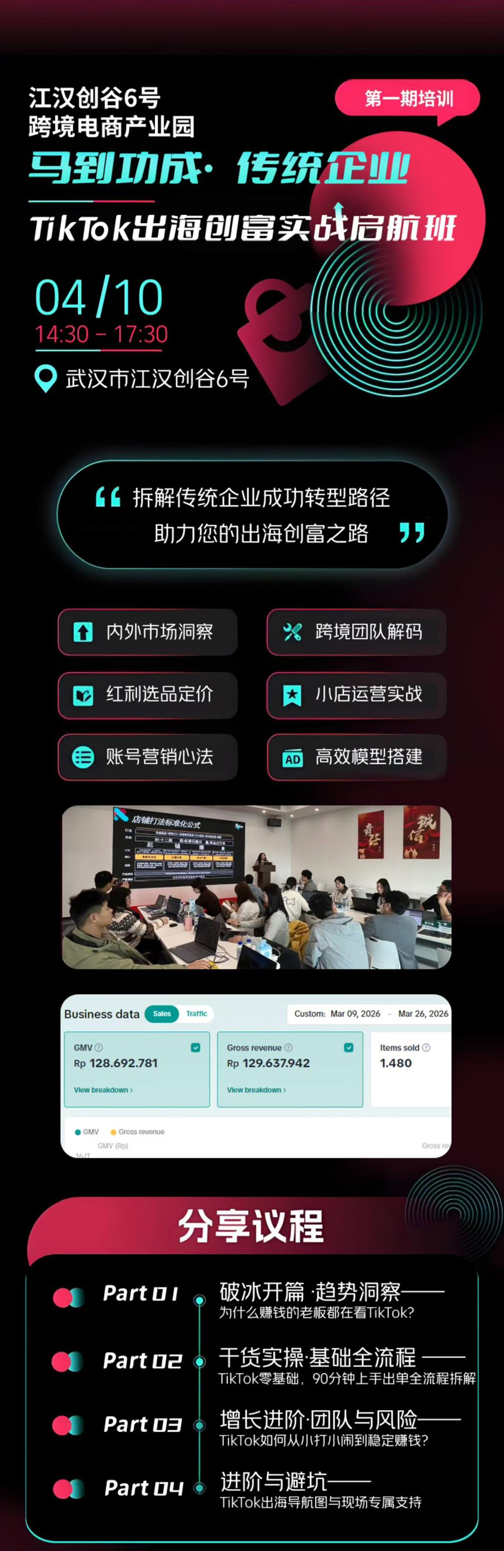 拆解传统企业成功转型路径,助力出海创富之路,包括内外市场洞察、跨境团队解码、红利润选品定价、小店运营实战、账号营销心法、高效模型搭建等议程。