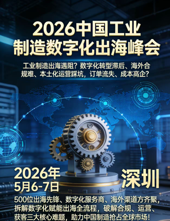 2026 年 5 月 6-7 日,美谬咨询将在深圳举办中国工业制造数字化出海峰会,聚焦 “工业制造数字化转型” 与 “企业全球化出海” 双核心。500 + 参会者将汇聚全球工业互联网、智能制造、跨境电商及海外园区的领军企业与专家,重点探讨数字孪生、工业元宇宙等前沿技术如何赋能制造企业降本增效、实现全球化突破。会议将分享头部制造企业数字化出海的成功案例与避坑指南,对接海外渠道、物流、金融、法律等一站式服务提供商,帮助制造企业破解出海难题,抢占全球市场先机。