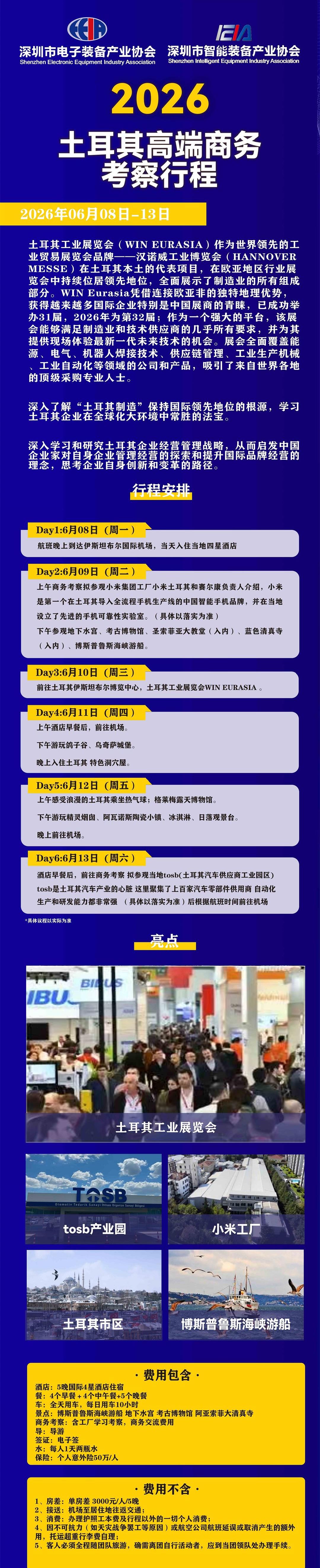 2026年6月8日 - 13日,深圳市电子装备产业协会、深圳市智能装备产业协会组织的土耳其高端商务考察行程重磅来袭!此次考察聚焦工业领域,将带您走进世界领先的土耳其工业展览会(WIN EURASIA),参观小米工厂、tosb(土耳其汽车供应商工业园区)等知名企业。这不仅是一次考察,更是企业提升国际视野、探索创新变革的绝佳契机。名额有限,速来报名,一同踏上这场工业商务探索之旅!