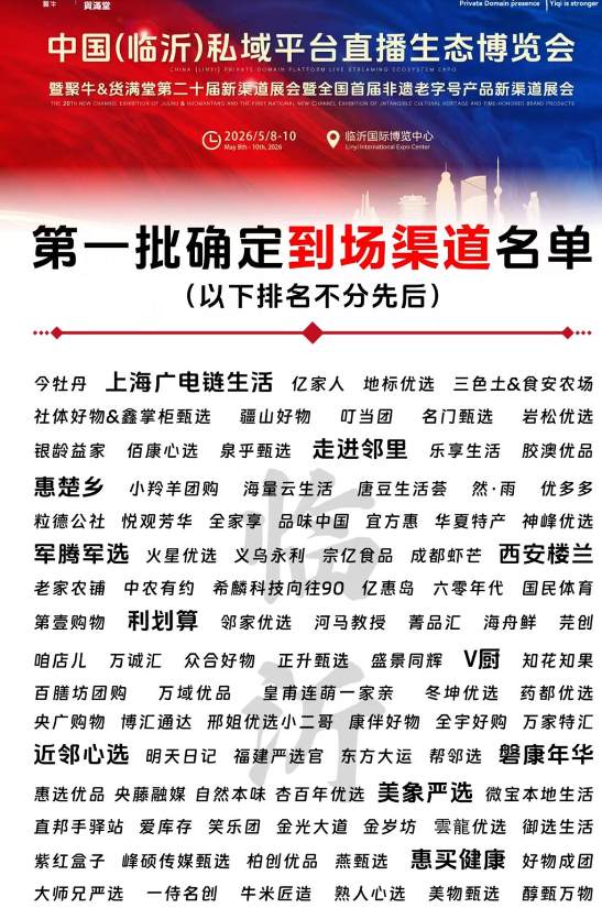2026年,直播电商正式迈入公域与私域协同、线上与线下融合的新阶段。在此背景下,由聚牛&货满堂主办的中国(临沂)直播电商品牌博览会将在临沂国际博览中心举行。展会旨在破解品牌方寻找优质渠道难、渠道方甄选爆品供应链难的行业痛点,致力于打造一个集前瞻趋势发布、年度智慧碰撞、全渠道资源对接的行业顶级盛会。