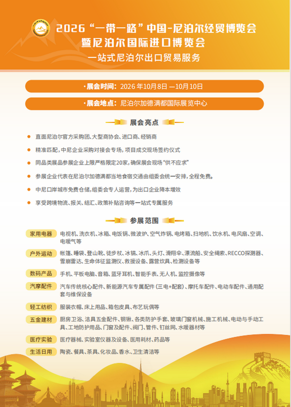 2026“一带一路”中尼经贸博览会暨尼泊尔国际进口博览会,是依托“一带一路”倡议、联动中尼两国打造的高规格跨境商贸盛会,展会聚焦家用电器、户外运动、数码产品、汽车与摩托车配件、轻工纺织、五金建材、医疗实验、生活日用等各类优质出口产品参展,搭建中尼企业面对面对接的核心平台。展会正式举办时间为2026年10月8日至10日,选址尼泊尔首都加德满都国际展览中心,地处市中心核心地段,交通便捷、商贸氛围浓厚。展会创新推出六大核心保障:加德满都中国城常设对接、吉隆及樟木口岸专属仓储、口岸常设展厅、保姆式全链条出口服务、中尼专属跨境电商平台、专项金融服务,一站式解决企业出海报关、物流、清关、资金、客源等各类痛点,精准邀约尼泊尔优质采购团现场洽谈签约,全力助力国内企业深耕尼泊尔市场、开拓南亚商贸蓝海,诚邀各大企业踊跃参展,共拓跨境贸易新商机。