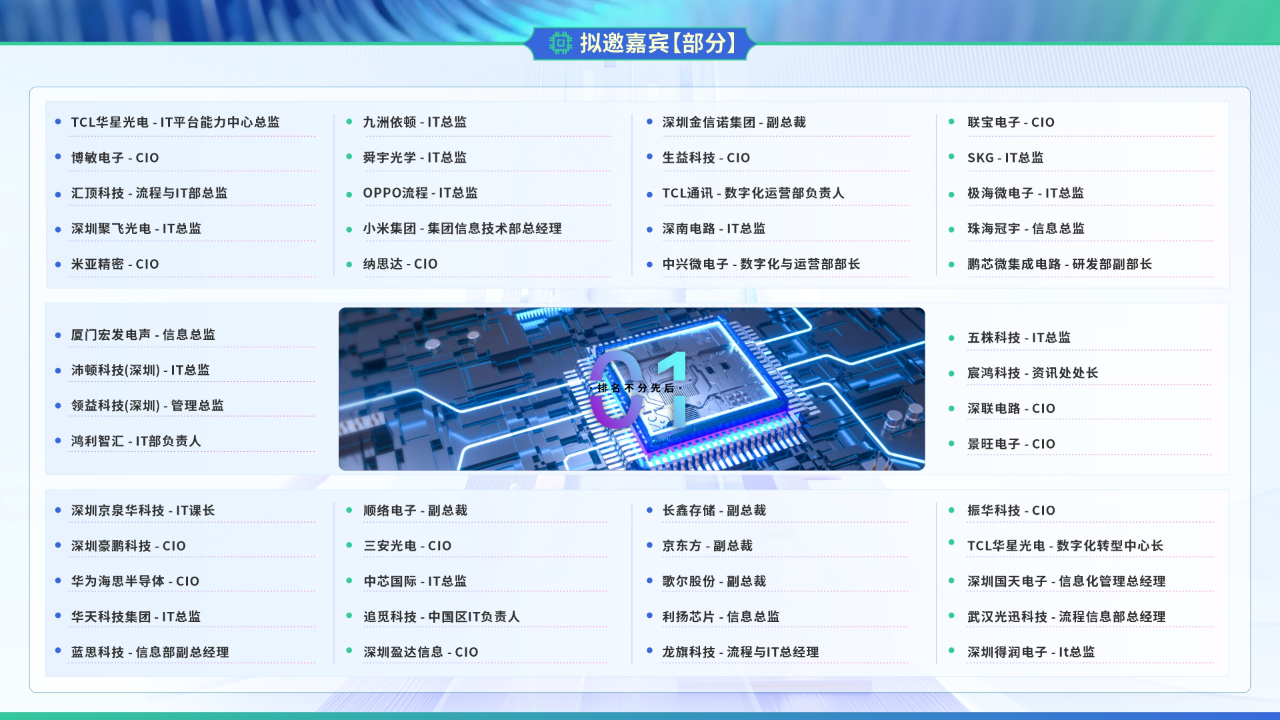 本次大会以“数智‘芯’世界”为主题,汇集230+电子、通信与半导行业数字化转型行业专家、企业高管、CIO、IT负责人及优秀信息化服务商,4 大论坛 + 20 场行业先锋演讲+ 1场圆桌讨论,为与会嘉宾带来一场前沿思维碰撞的盛宴,见证数字技术赋能产业的磅礴力量!