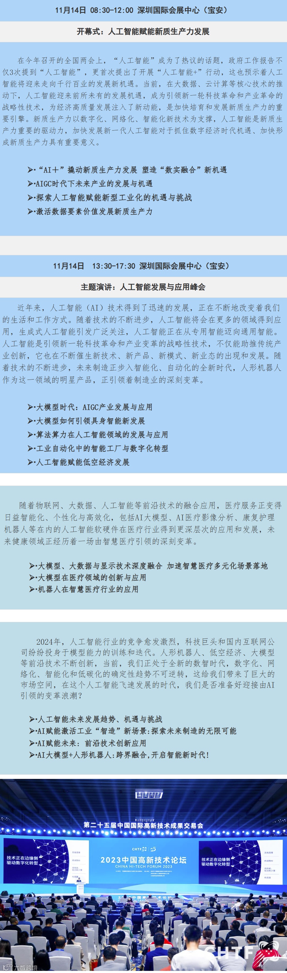第26届高交“中国高新技术论坛”将于2024年11月14日举办,论坛主题为:“人工智能赋能新质生产力发展”。