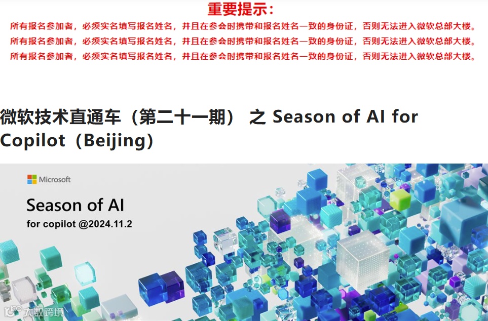 记住2024年11月2日下午,中国——北京——中关村——微软(中国)总部,Season of AI for Copilot(Beijing)期待你的参与。