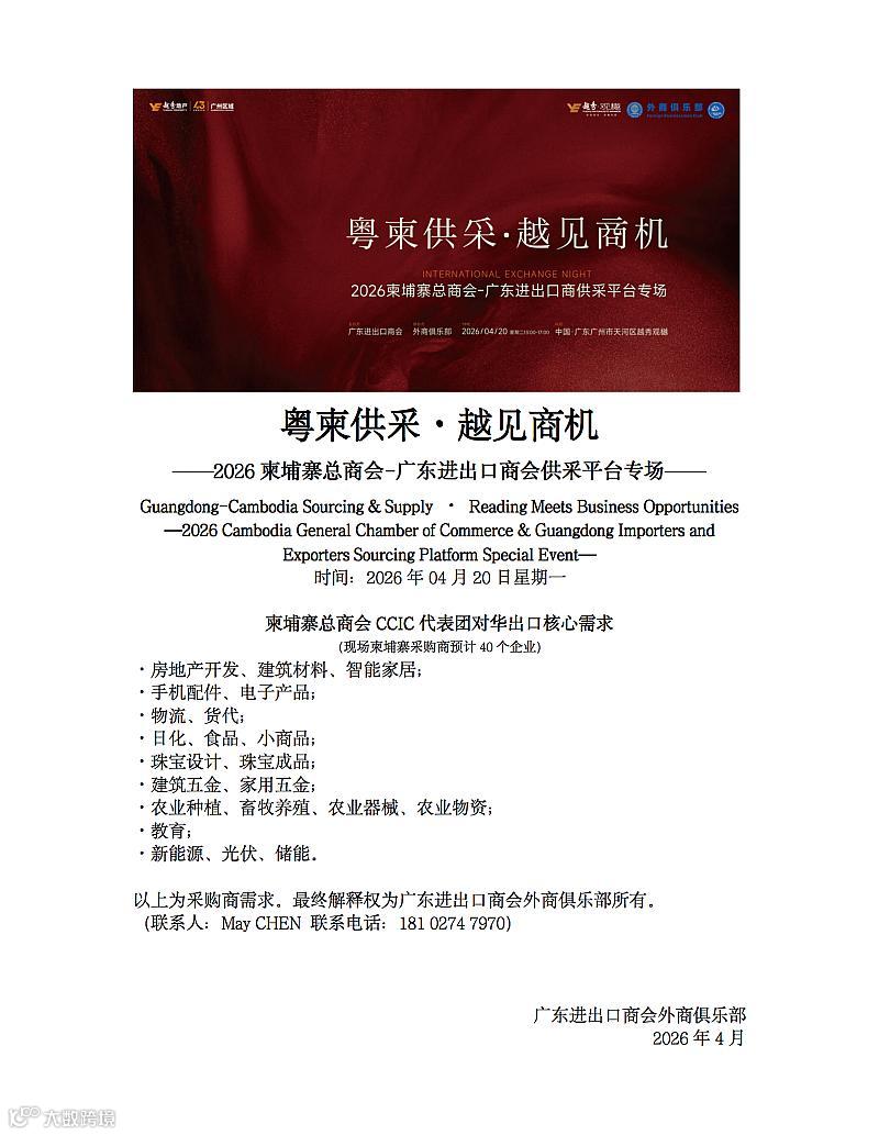 “粤东供采●越见商机”——2026柬埔寨总商会-广东进出口商会供采平台专场