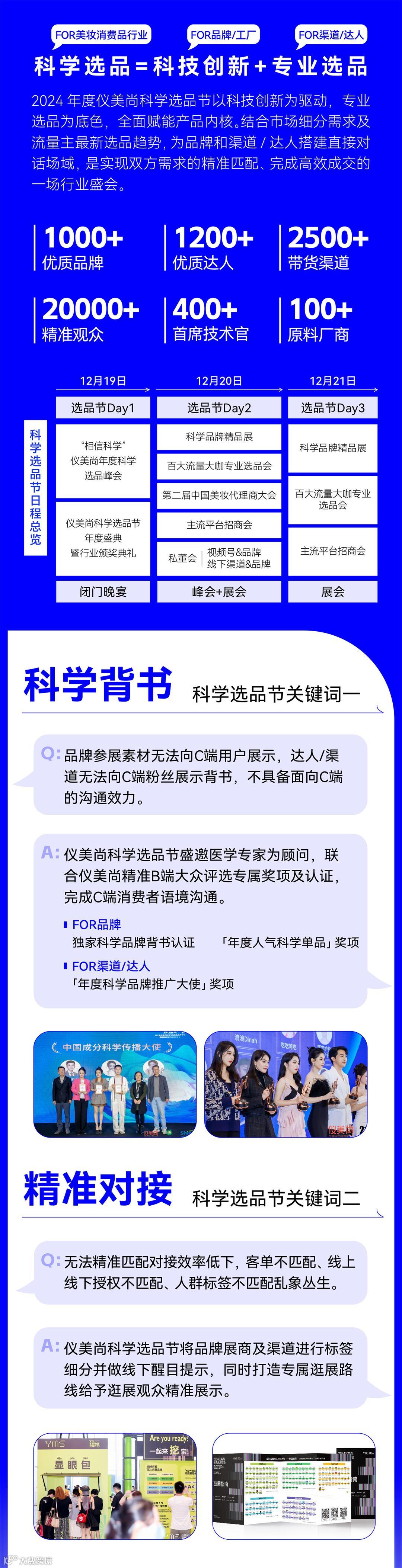 【2024年度仪美尚科学选品节】由仪美尚发起,以科技创新为驱动,专业选品为底色,全面赋能产品内核。结合市场细分需求及流量主最新选品趋势,全网优质渠道及达人共同参与,旨在为品牌和渠道/达人搭建直接对话场域,实现双方需求的精准匹配,完成高效成交的一场行业盛会。