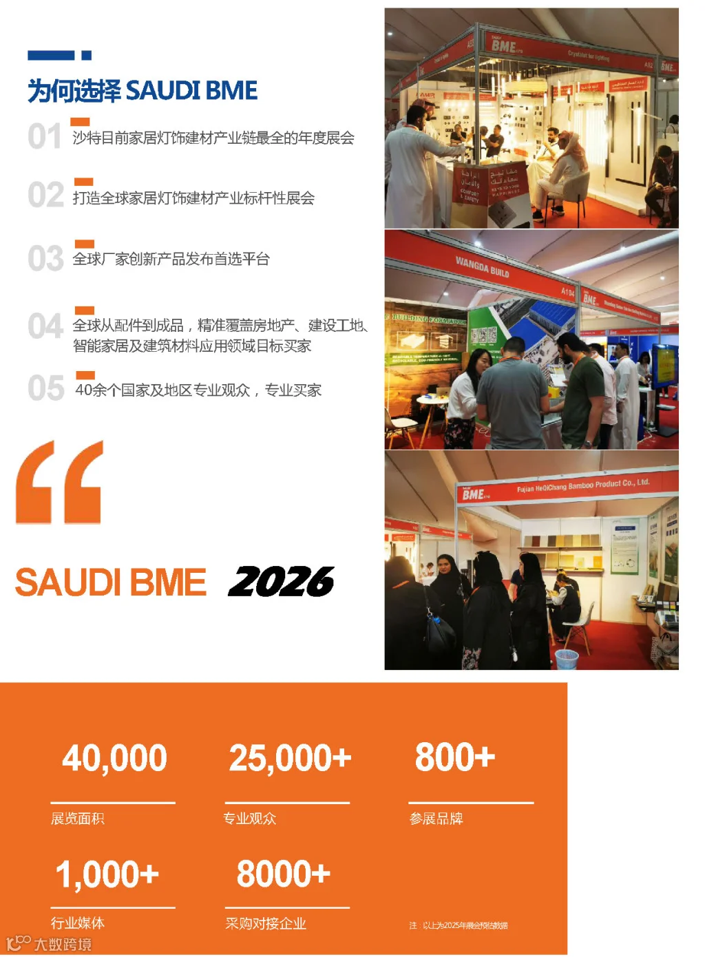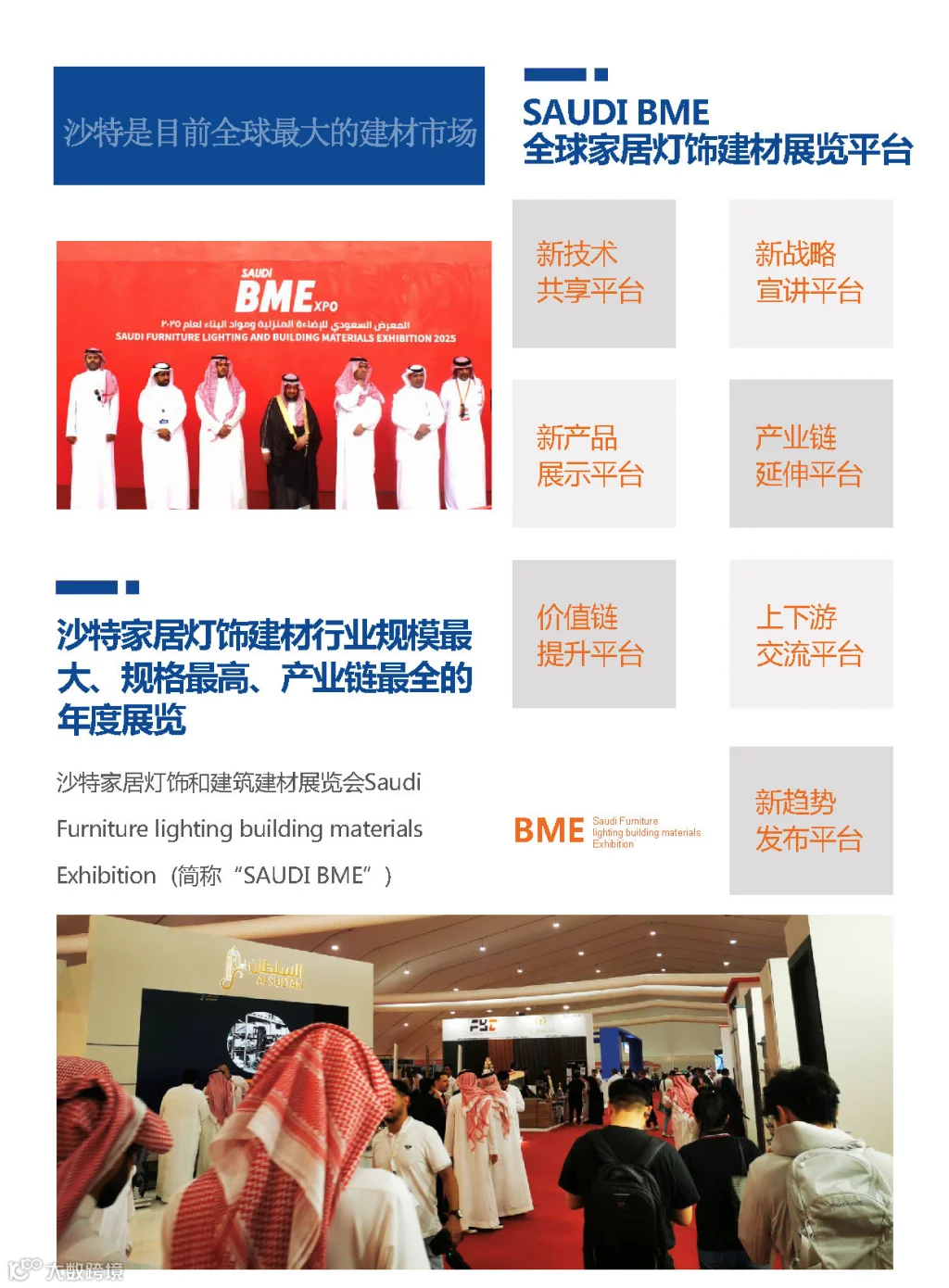沙特家居灯饰和建筑建材展(BME)是中东家居灯饰建材领域标志性展会之一,每年在沙特利雅得国际会展中心举办,是全球建材企业布局中东市场的核心平台。