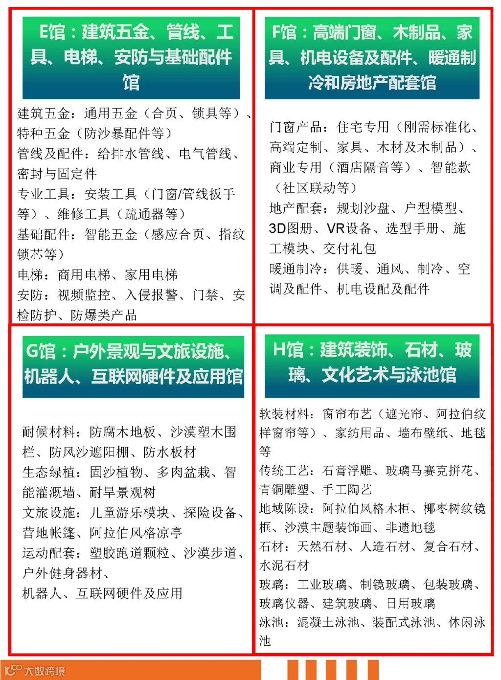 H馆:建筑装饰、石材、玻 璃、文化艺术与泳池馆:软装材料:窗帘布艺(遮光帘、阿拉伯纹 样窗帘等)、家纺用品、墙布壁纸、地毯 等 传统工艺:石膏浮雕、玻璃马赛克拼花、 青铜雕塑、手工陶艺 地域陈设:阿拉伯风格木柜、椰枣树纹镜 框、沙漠主题装饰画、非遗地毯 石材:天然石材、人造石材、复合石材、 水泥石材 玻璃:工业玻璃、制镜玻璃、包装玻璃、 玻璃仪器、建筑玻璃、日用玻璃 泳池:混凝土泳池、装配式泳池、休闲泳池