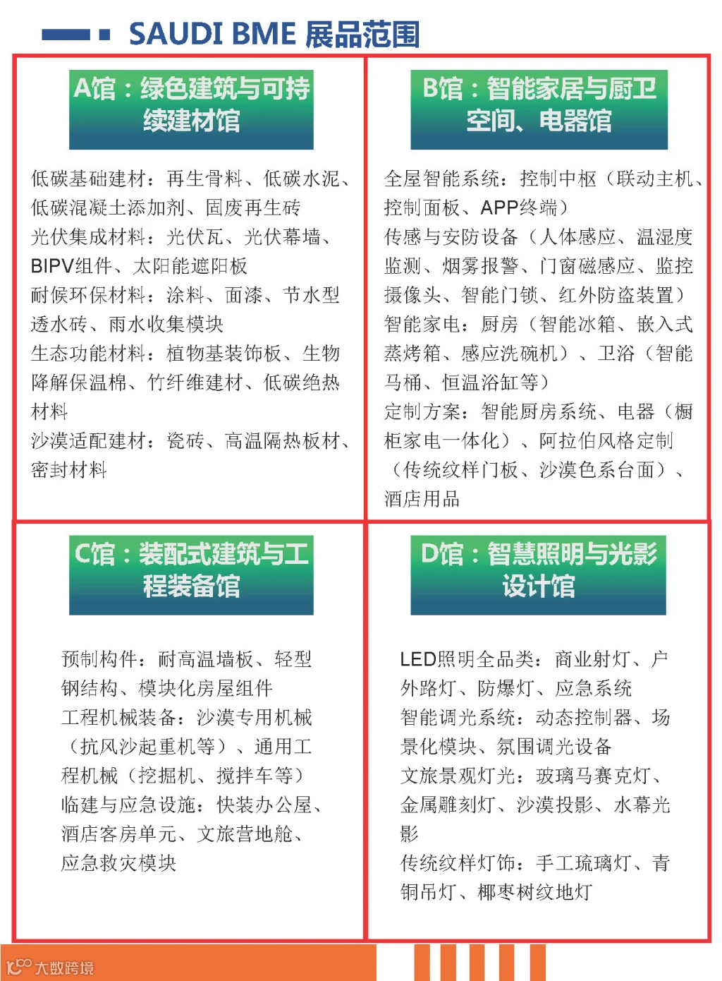 D馆:智慧照明与光影设计馆:LED照明全品类:商业射灯、户 外路灯、防爆灯、应急系统 智能调光系统:动态控制器、场 景化模块、氛围调光设备 文旅景观灯光:玻璃马赛克灯、 金属雕刻灯、沙漠投影、水幕光 影 传统纹样灯饰:手工琉璃灯、青 铜吊灯、椰枣树纹地灯